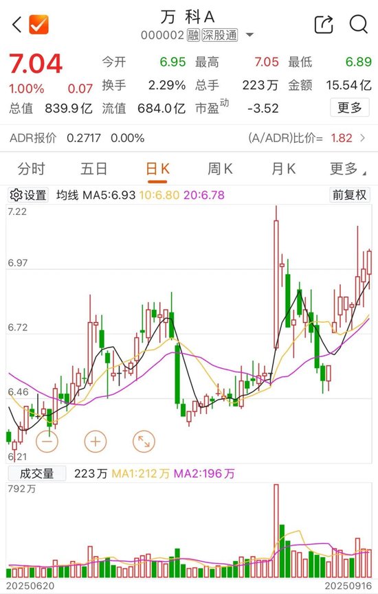 截至9月16日收盘,万科A涨1%,报7.04元/股,市值839.9亿元。